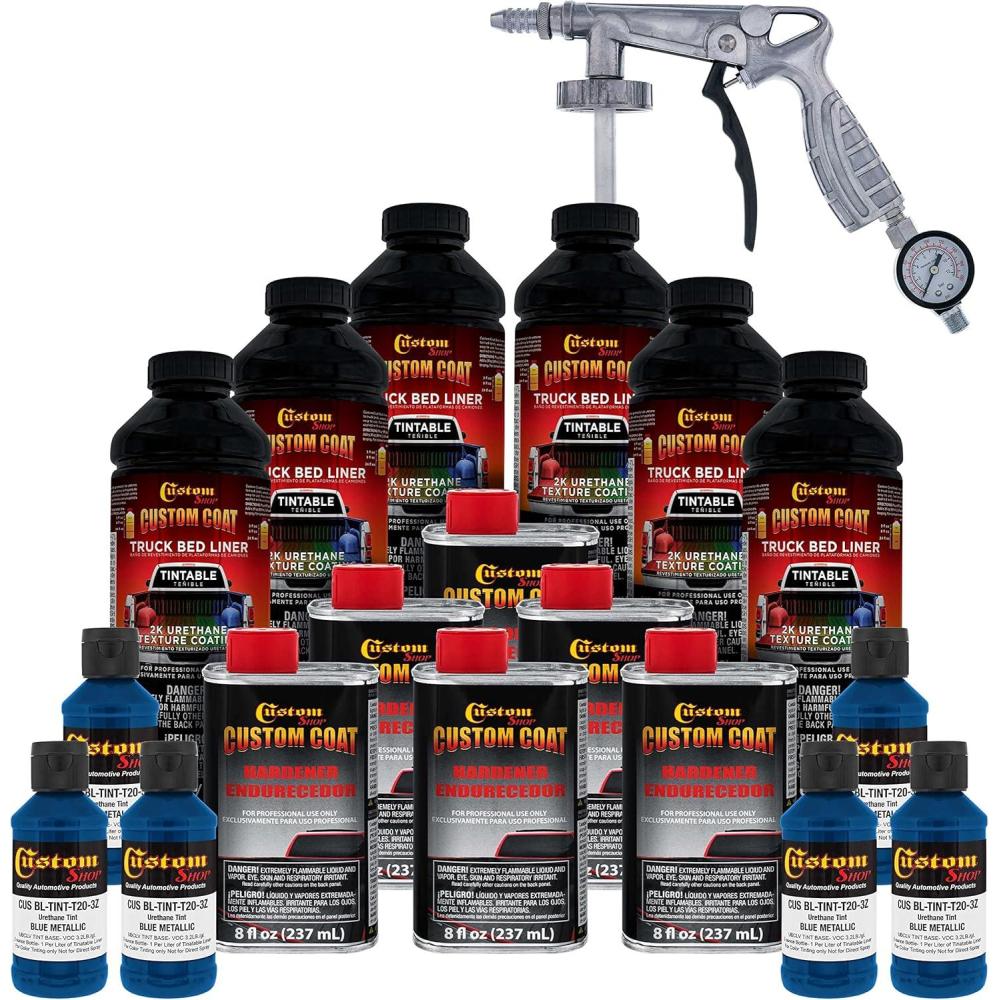 Custom Coat Blue Metallic 1.5 Gallon (6 Quart) Urethane Spray-On Truck Bed Liner Kit with Spray Gun and Regulator - Easy Mixing, Shake, Shoot - Textured Protective Coating, Prevent Rust - Car, Auto
