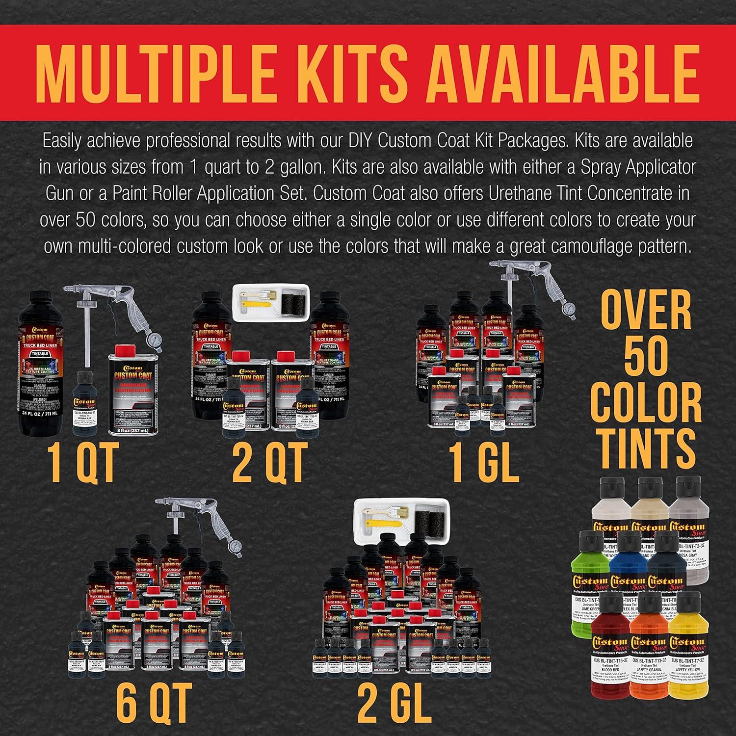Professional Custom Coat Spray-On Truck Bed Liner 1 Quart Kit. Custom Tintable Color Kit Includes: 1 – 21 fl. oz. Cans of Tintable Truck Bed Liner Base, 1 – 8 fl. oz. Cans Custom Coat Standard Hardener, 1 – 3 fl. oz. Bottles of Custom Shop Basecoat Color Tint and 1 Custom Coat Applicator Spray Gun with Regulator. Estimated coverage is 110 to 130 square feet @ 10 mils wet film thickness.