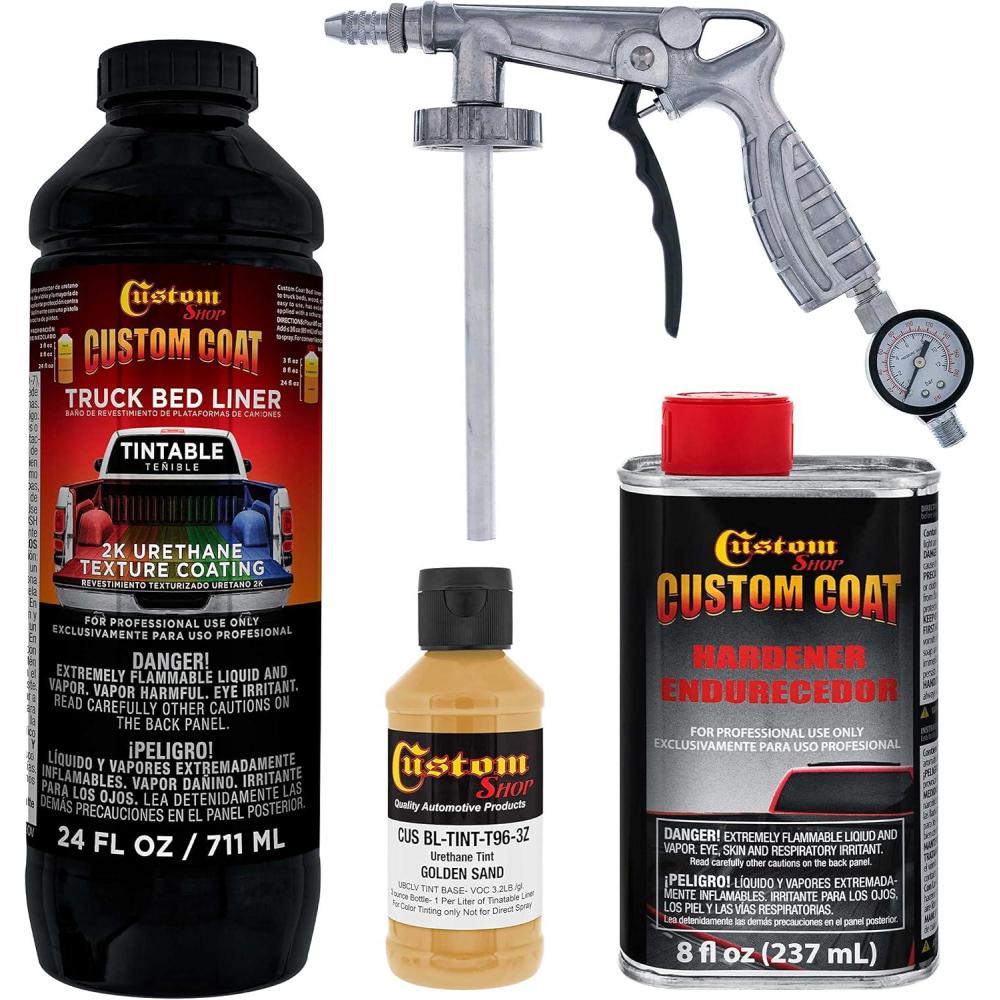 Professional Custom Coat Spray-On Truck Bed Liner 1 Quart Kit. Custom Tintable Color Kit Includes: 1 – 21 fl. oz. Cans of Tintable Truck Bed Liner Base, 1 – 8 fl. oz. Cans Custom Coat Standard Hardener, 1 – 3 fl. oz. Bottles of Custom Shop Basecoat Color Tint and 1 Custom Coat Applicator Spray Gun with Regulator. Estimated coverage is 110 to 130 square feet @ 10 mils wet film thickness.
