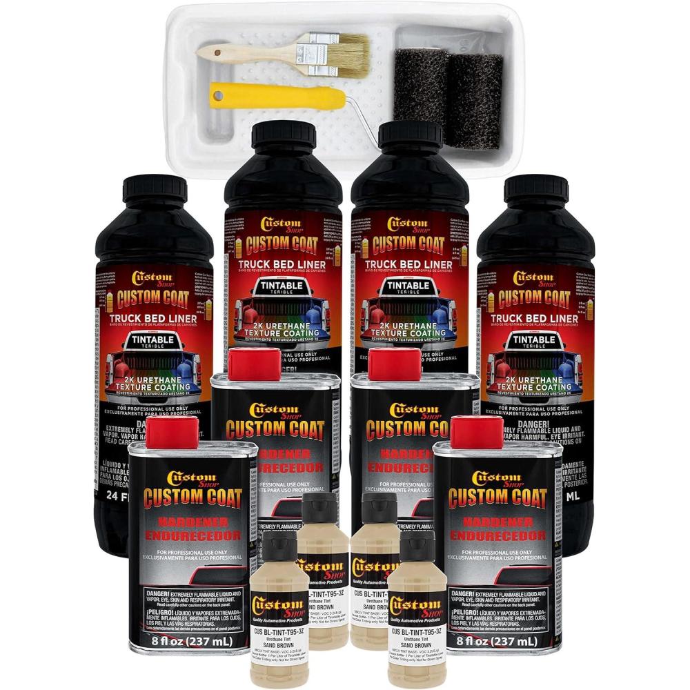 Professional Custom Coat Roll-On, Brush-On or Spray-On Truck Bed Liner 1 Gallon (4 Quart) Kit. Custom Tintable Color Kit Includes: 4 – 21 fl. oz. Cans of Tintable Truck Bed Liner Base, 4 – 8 fl. oz. Cans Custom Coat Standard Hardener and 4 – 3 fl. oz. Bottles of Custom Shop Basecoat Color Tint, and 1 Custom Coat 7 Piece Paint Roller Applicator Kit with 2 Rollers, Frame, 2 Brushes and Coating Tray with Liner. Estimated coverage is 110 to 130 square feet @ 10 mils wet film thickness.