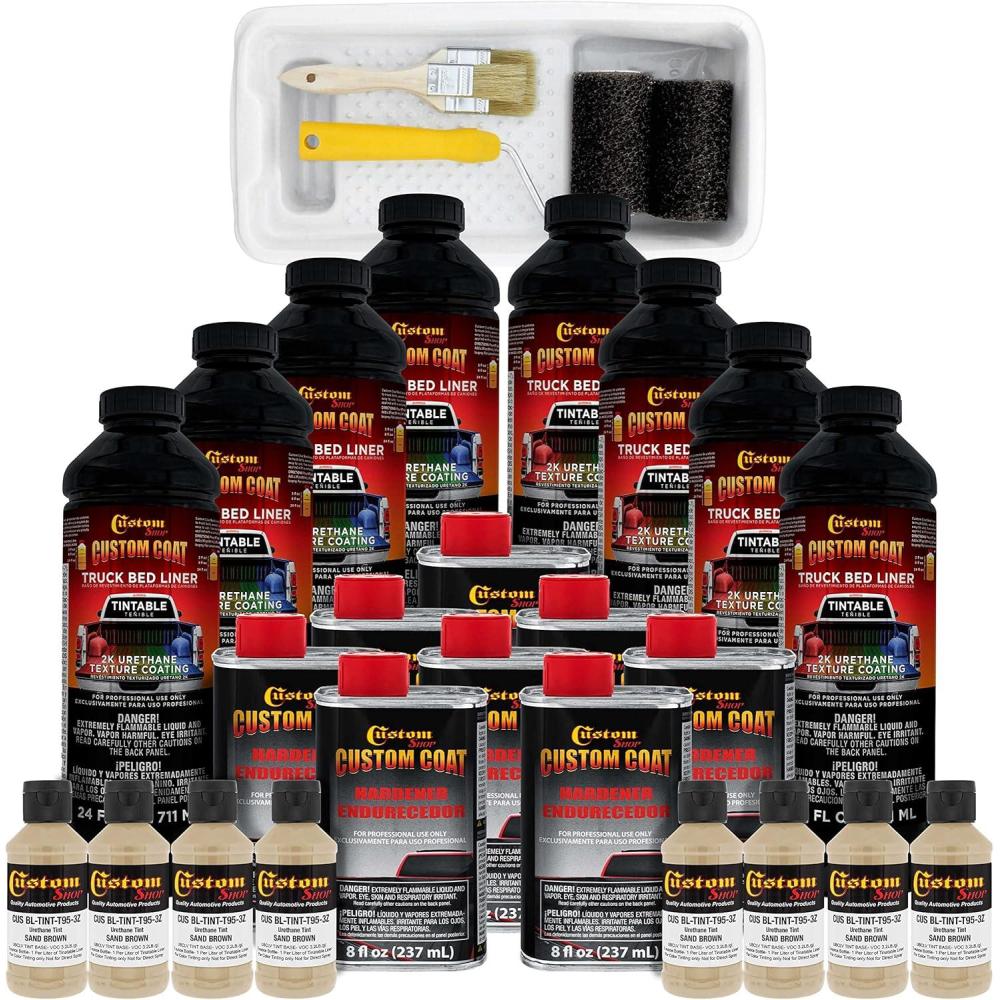 Professional Custom Coat Roll-On, Brush-On or Spray-On Truck Bed Liner 2 Gallon (8 Quart) Kit. Custom Tintable Color Kit Includes: 8 – 21 fl. oz. Cans of Tintable Truck Bed Liner Base, 8 – 8 fl. oz. Cans Custom Coat Standard Hardener and 8 – 3 fl. oz. Bottles of Custom Shop Basecoat Color Tint, and 1 Custom Coat 7 Piece Paint Roller Applicator Kit with 2 Rollers, Frame, 2 Brushes and Coating Tray with Liner. Estimated coverage is 110 to 130 square feet @ 10 mils wet film thickness.