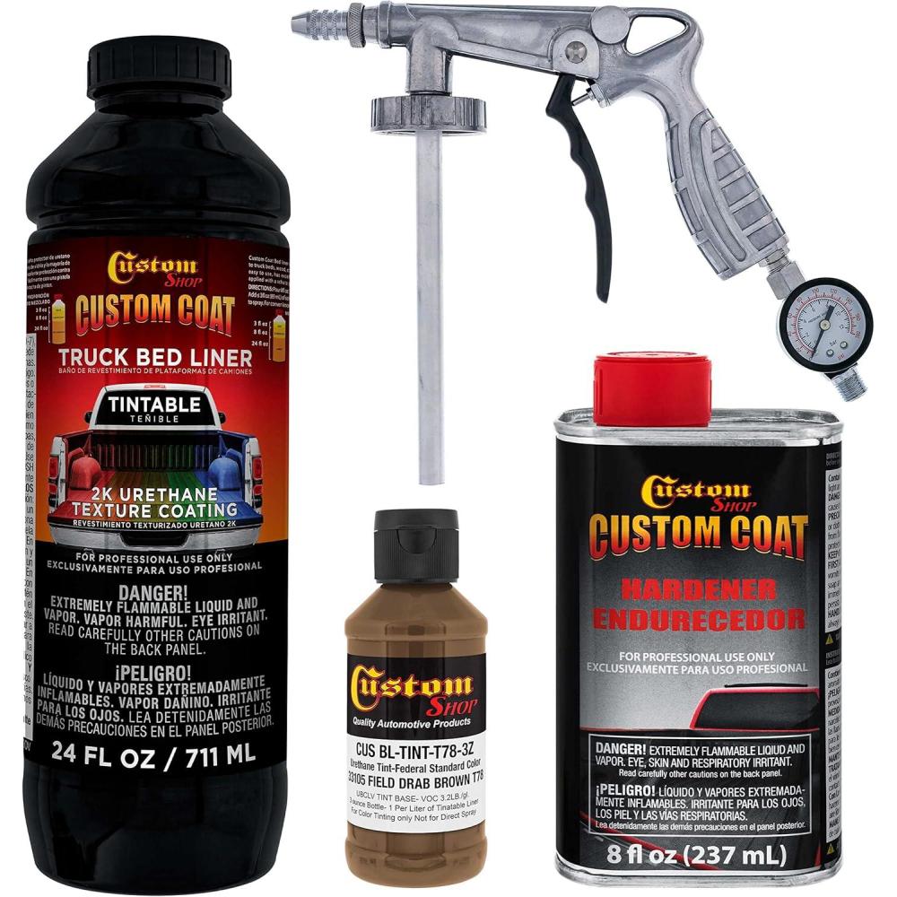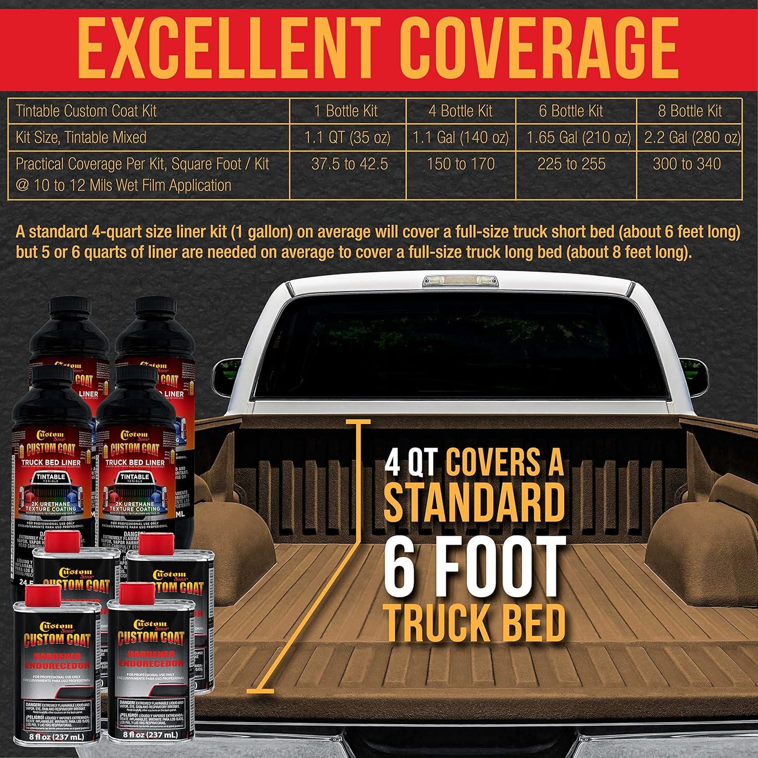 Professional Custom Coat Spray-On Truck Bed Liner 1 Quart Kit. Custom Tintable Color Kit Includes: 1 – 21 fl. oz. Cans of Tintable Truck Bed Liner Base, 1 – 8 fl. oz. Cans Custom Coat Standard Hardener, 1 – 3 fl. oz. Bottles of Custom Shop Basecoat Color Tint and 1 Custom Coat Applicator Spray Gun with Regulator. Estimated coverage is 110 to 130 square feet @ 10 mils wet film thickness.