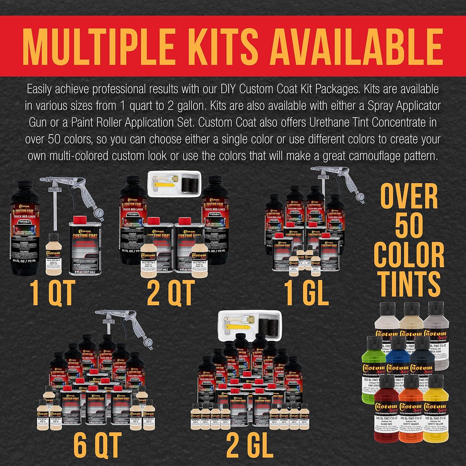 Professional Custom Coat Roll-On, Brush-On or Spray-On Truck Bed Liner 1 Quart Kit. Custom Tintable Color Kit Includes: 1 – 21 fl. oz. Cans of Tintable Truck Bed Liner Base, 1 – 8 fl. oz. Cans Custom Coat Standard Hardener and 1 – 3 fl. oz. Bottles of Custom Shop Basecoat Color Tint, and 1 Custom Coat 7 Piece Paint Roller Applicator Kit with 2 Rollers, Frame, 2 Brushes and Coating Tray with Liner. Estimated coverage is 110 to 130 square feet @ 10 mils wet film thickness.