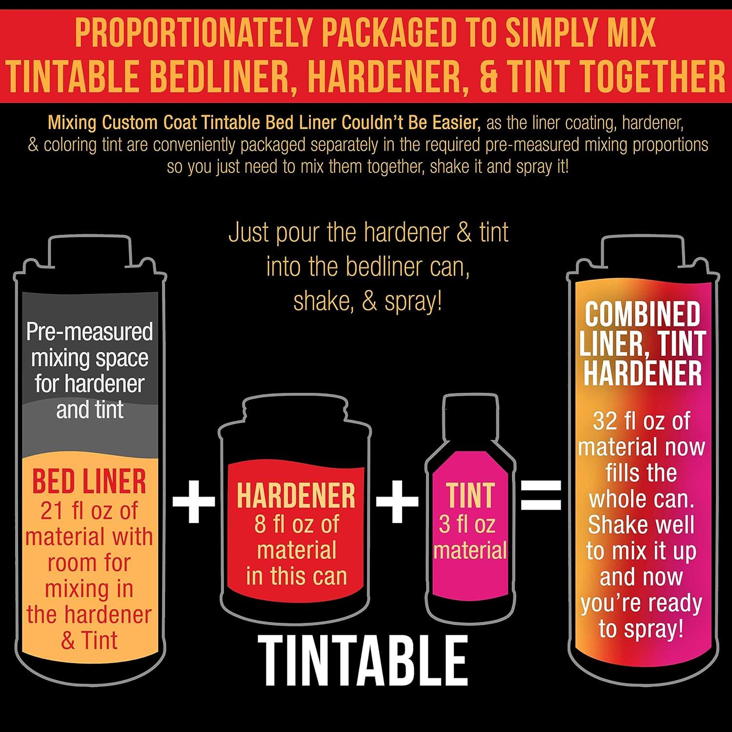 Professional Custom Coat Spray-On Truck Bed Liner 1 Quart Kit. Custom Tintable Color Kit Includes: 1 – 21 fl. oz. Cans of Tintable Truck Bed Liner Base, 1 – 8 fl. oz. Cans Custom Coat Standard Hardener, 1 – 3 fl. oz. Bottles of Custom Shop Basecoat Color Tint and 1 Custom Coat Applicator Spray Gun with Regulator. Estimated coverage is 110 to 130 square feet @ 10 mils wet film thickness.