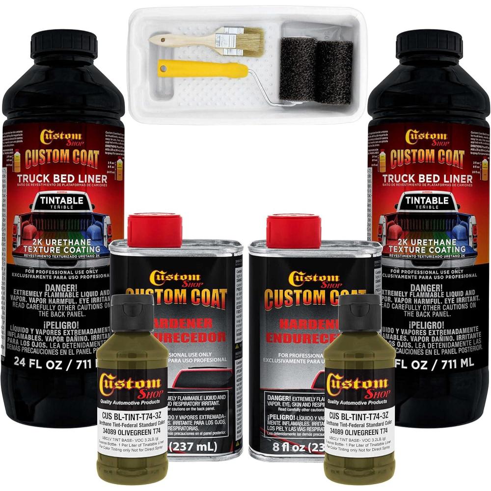 Professional Custom Coat Roll-On, Brush-On or Spray-On Truck Bed Liner 2 Quart Kit. Custom Tintable Color Kit Includes: 2 – 21 fl. oz. Cans of Tintable Truck Bed Liner Base, 2 – 8 fl. oz. Cans Custom Coat Standard Hardener and 2 – 3 fl. oz. Bottles of Custom Shop Basecoat Color Tint, and 1 Custom Coat 7 Piece Paint Roller Applicator Kit with 2 Rollers, Frame, 2 Brushes and Coating Tray with Liner. Estimated coverage is 110 to 130 square feet @ 10 mils wet film thickness.