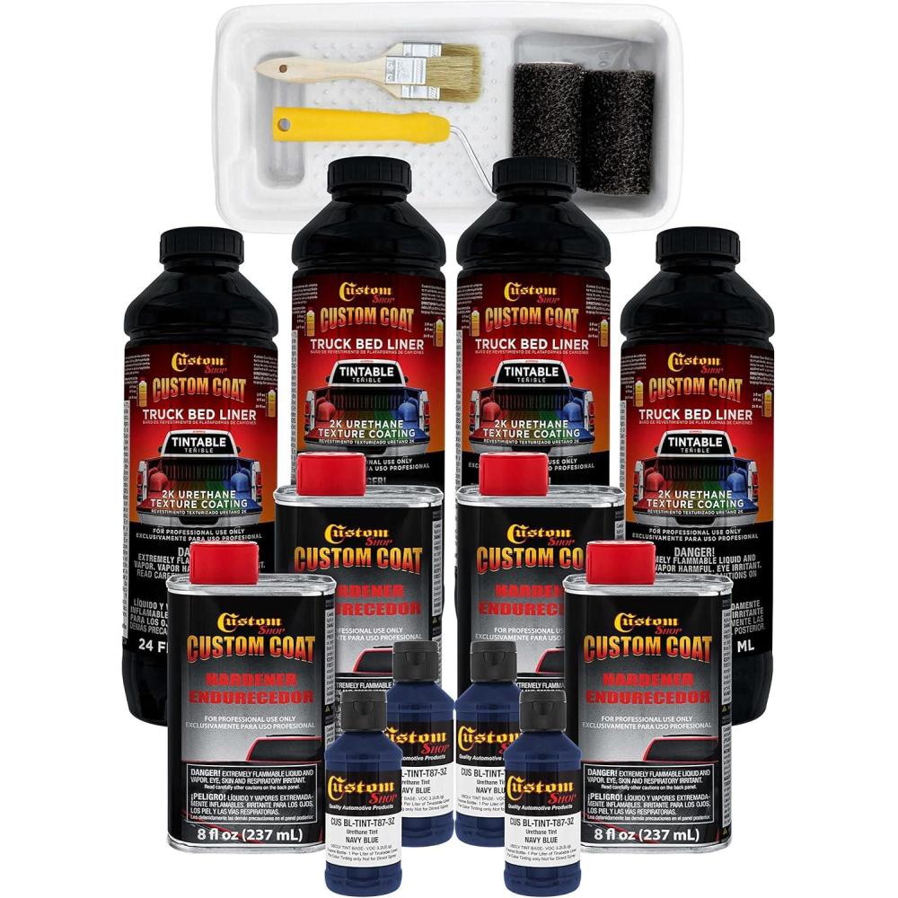 Professional Custom Coat Roll-On, Brush-On or Spray-On Truck Bed Liner 1 Gallon (4 Quart) Kit. Custom Tintable Color Kit Includes: 4 – 21 fl. oz. Cans of Tintable Truck Bed Liner Base, 4 – 8 fl. oz. Cans Custom Coat Standard Hardener and 4 – 3 fl. oz. Bottles of Custom Shop Basecoat Color Tint, and 1 Custom Coat 7 Piece Paint Roller Applicator Kit with 2 Rollers, Frame, 2 Brushes and Coating Tray with Liner. Estimated coverage is 110 to 130 square feet @ 10 mils wet film thickness.