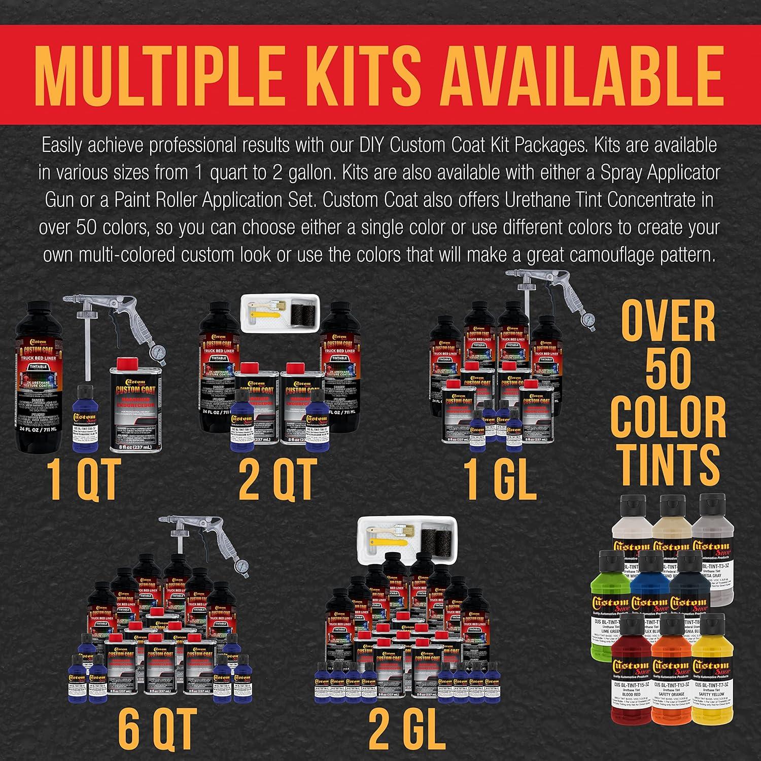 Professional Custom Coat Roll-On, Brush-On or Spray-On Truck Bed Liner 1.5 Gallon (6 Quart) Kit. Custom Tintable Color Kit Includes: 6 – 21 fl. oz. Cans of Tintable Truck Bed Liner Base, 6 – 8 fl. oz. Cans Custom Coat Standard Hardener and 6 – 3 fl. oz. Bottles of Custom Shop Basecoat Color Tint, and 1 Custom Coat 7 Piece Paint Roller Applicator Kit with 2 Rollers, Frame, 2 Brushes and Coating Tray with Liner. Estimated coverage is 110 to 130 square feet @ 10 mils wet film thickness.
