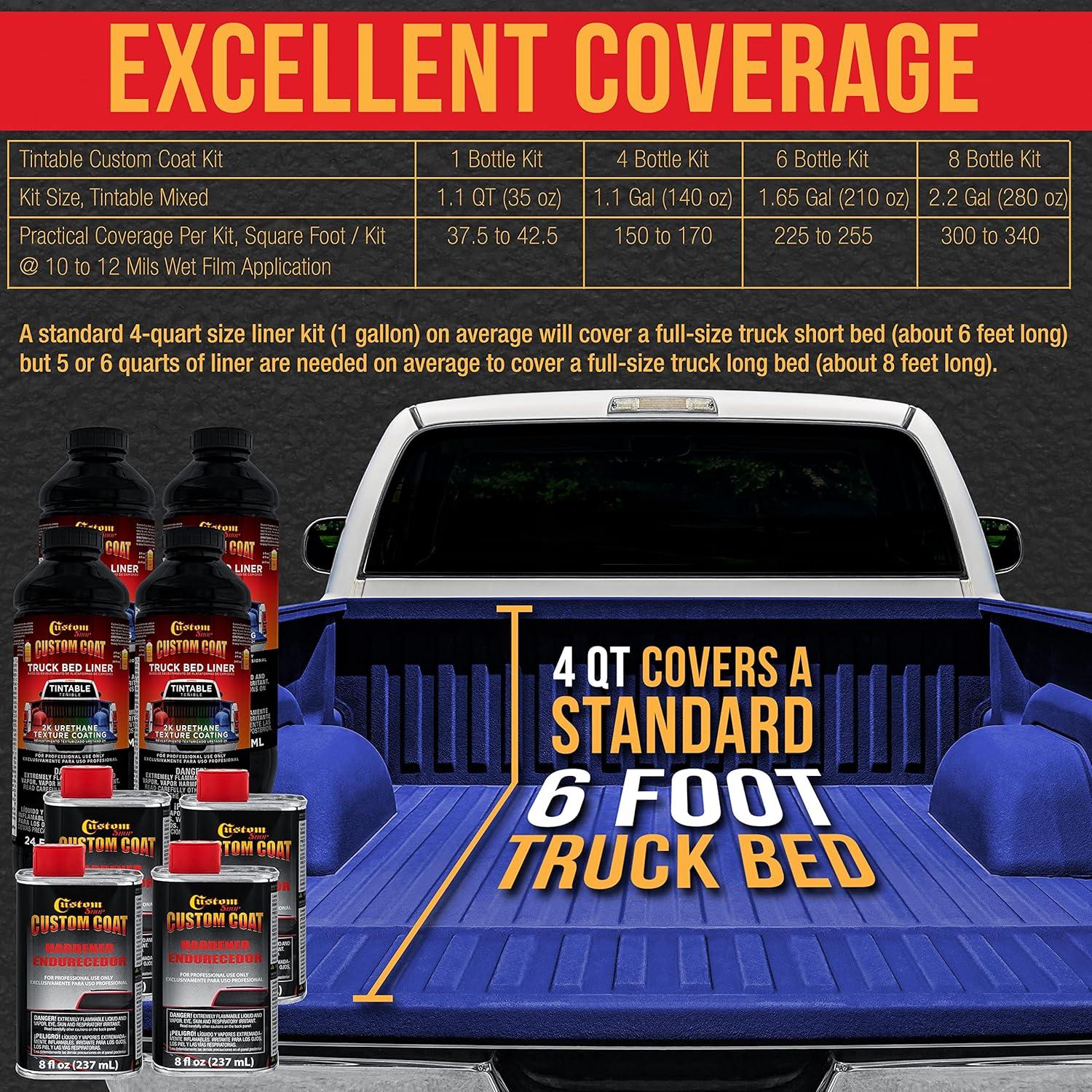 Professional Custom Coat Spray-On Truck Bed Liner 2 Gallon Kit. Custom Tintable Color Kit Includes: 8 – 21 fl. oz. Cans of Tintable Truck Bed Liner Base, 8 – 8 fl. oz. Cans Custom Coat Standard Hardener, 8 – 3 fl. oz. Bottles of Custom Shop Basecoat Color Tint and 1 Custom Coat Applicator Spray Gun with Regulator. Estimated coverage is 110 to 130 square feet @ 10 mils wet film thickness.