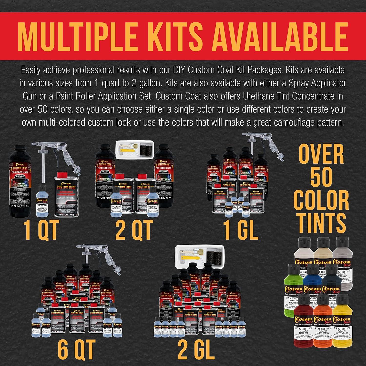 Professional Custom Coat Spray-On Truck Bed Liner 1 Quart Kit. Custom Tintable Color Kit Includes: 1 – 21 fl. oz. Cans of Tintable Truck Bed Liner Base, 1 – 8 fl. oz. Cans Custom Coat Standard Hardener, 1 – 3 fl. oz. Bottles of Custom Shop Basecoat Color Tint and 1 Custom Coat Applicator Spray Gun with Regulator. Estimated coverage is 110 to 130 square feet @ 10 mils wet film thickness.