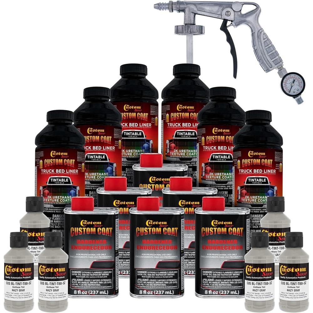 Professional Custom Coat Spray-On Truck Bed Liner 1.5 Gallon Kit. Custom Tintable Color Kit Includes: 6 – 21 fl. oz. Cans of Tintable Truck Bed Liner Base, 6 – 8 fl. oz. Cans Custom Coat Standard Hardener, 6 – 3 fl. oz. Bottles of Custom Shop Basecoat Color Tint and 1 Custom Coat Applicator Spray Gun with Regulator. Estimated coverage is 110 to 130 square feet @ 10 mils wet film thickness.
