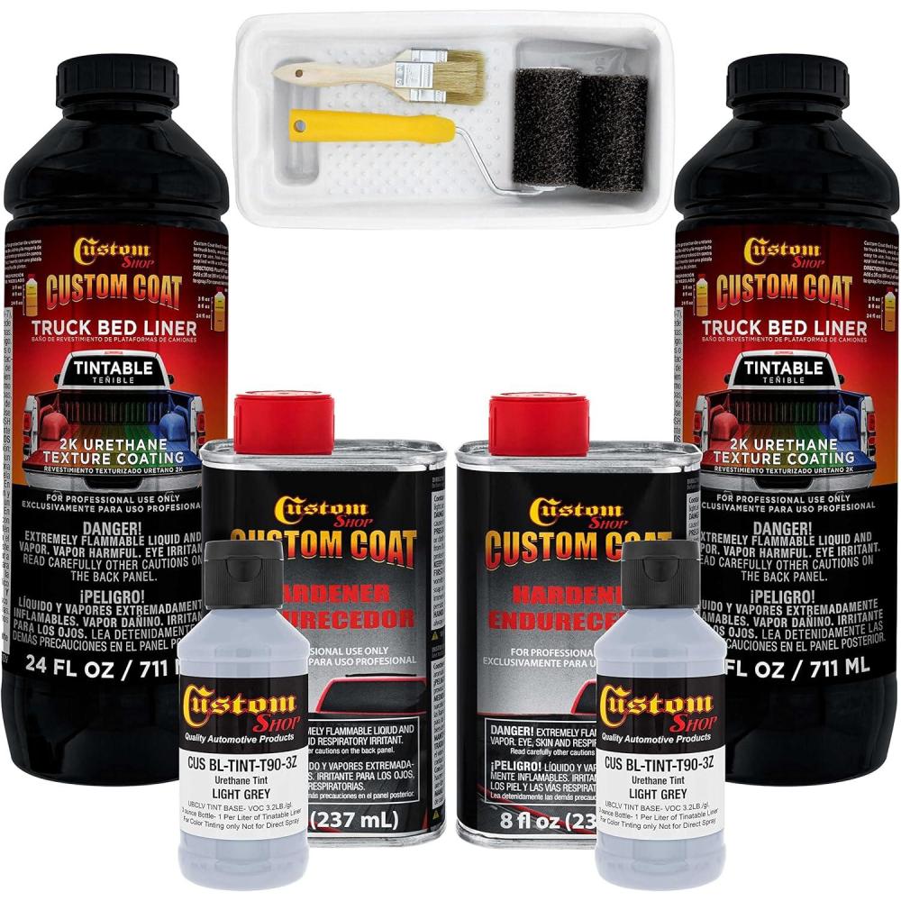 Professional Custom Coat Roll-On, Brush-On or Spray-On Truck Bed Liner 2 Quart Kit. Custom Tintable Color Kit Includes: 2 – 21 fl. oz. Cans of Tintable Truck Bed Liner Base, 2 – 8 fl. oz. Cans Custom Coat Standard Hardener and 2 – 3 fl. oz. Bottles of Custom Shop Basecoat Color Tint, and 1 Custom Coat 7 Piece Paint Roller Applicator Kit with 2 Rollers, Frame, 2 Brushes and Coating Tray with Liner. Estimated coverage is 110 to 130 square feet @ 10 mils wet film thickness.