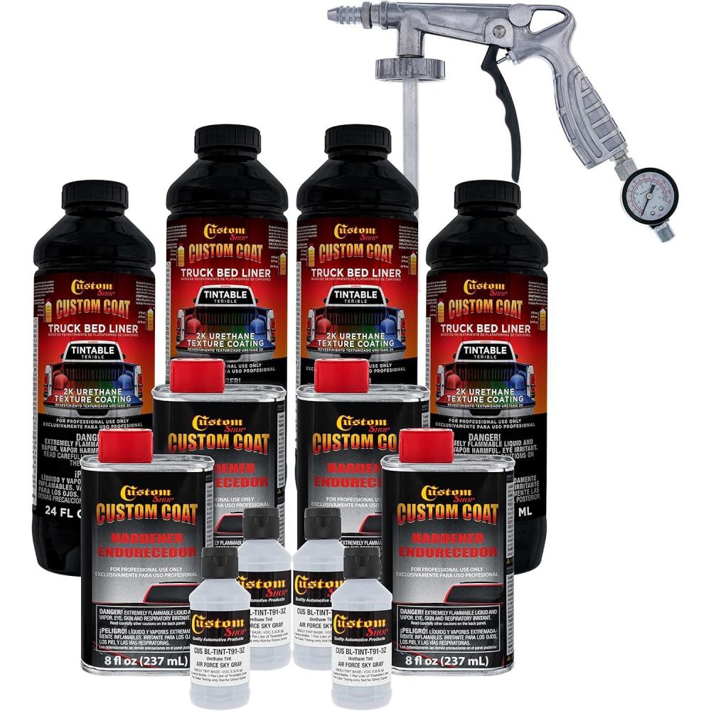 Professional Custom Coat Spray-On Truck Bed Liner 1 Gallon Kit. Custom Tintable Color Kit Includes: 4 – 21 fl. oz. Cans of Tintable Truck Bed Liner Base, 4 – 8 fl. oz. Cans Custom Coat Standard Hardener, 4 – 3 fl. oz. Bottles of Custom Shop Basecoat Color Tint and 1 Custom Coat Applicator Spray Gun with Regulator. Estimated coverage is 110 to 130 square feet @ 10 mils wet film thickness.