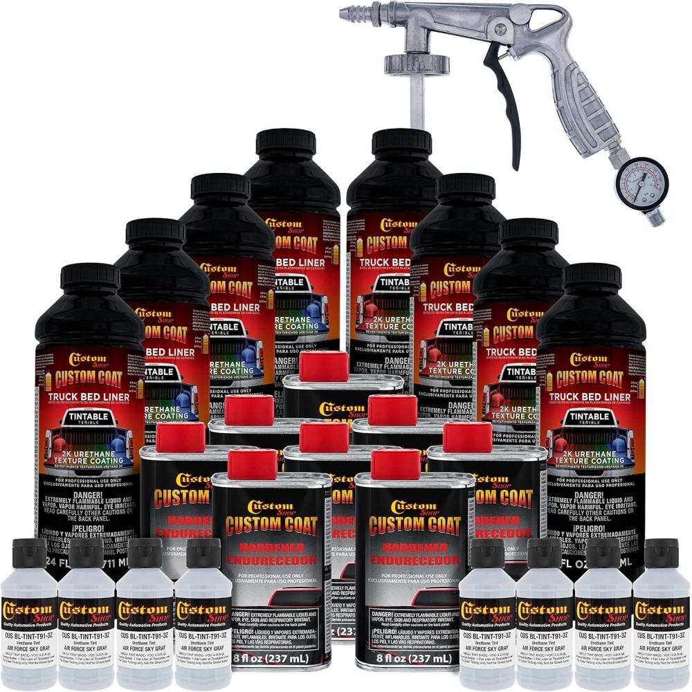Professional Custom Coat Spray-On Truck Bed Liner 2 Gallon Kit. Custom Tintable Color Kit Includes: 8 – 21 fl. oz. Cans of Tintable Truck Bed Liner Base, 8 – 8 fl. oz. Cans Custom Coat Standard Hardener, 8 – 3 fl. oz. Bottles of Custom Shop Basecoat Color Tint and 1 Custom Coat Applicator Spray Gun with Regulator. Estimated coverage is 110 to 130 square feet @ 10 mils wet film thickness.