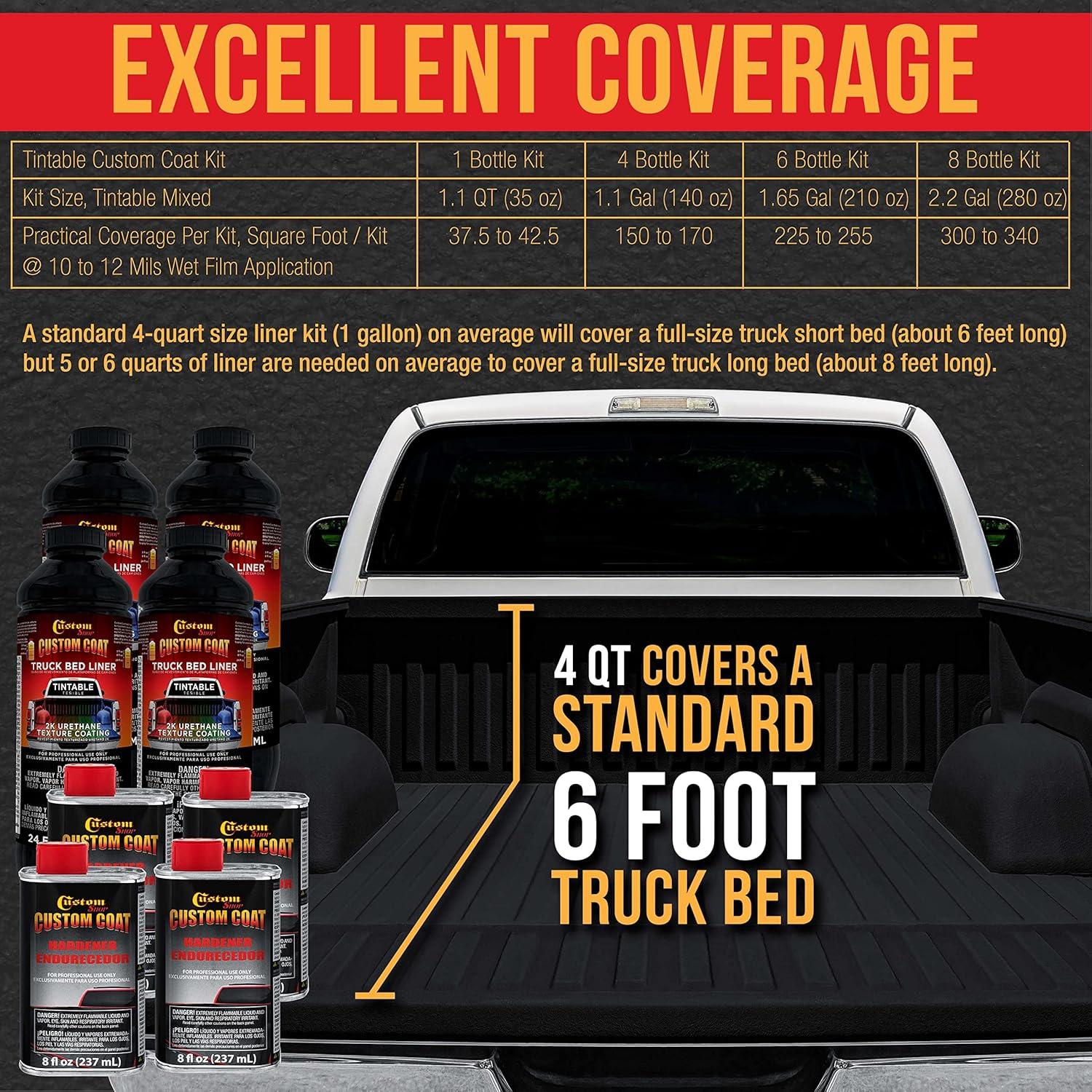 Professional Custom Coat Roll-On, Brush-On or Spray-On Truck Bed Liner 2 Quart Kit. Custom Tintable Color Kit Includes: 2 – 21 fl. oz. Cans of Tintable Truck Bed Liner Base, 2 – 8 fl. oz. Cans Custom Coat Standard Hardener and 2 – 3 fl. oz. Bottles of Custom Shop Basecoat Color Tint, and 1 Custom Coat 7 Piece Paint Roller Applicator Kit with 2 Rollers, Frame, 2 Brushes and Coating Tray with Liner. Estimated coverage is 110 to 130 square feet @ 10 mils wet film thickness.
