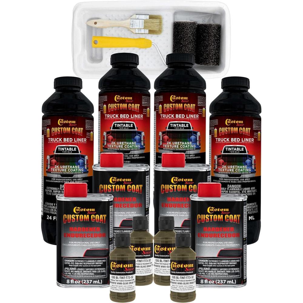 Professional Custom Coat Roll-On, Brush-On or Spray-On Truck Bed Liner 1 Gallon (4 Quart) Kit. Custom Tintable Color Kit Includes: 4 – 21 fl. oz. Cans of Tintable Truck Bed Liner Base, 4 – 8 fl. oz. Cans Custom Coat Standard Hardener and 4 – 3 fl. oz. Bottles of Custom Shop Basecoat Color Tint, and 1 Custom Coat 7 Piece Paint Roller Applicator Kit with 2 Rollers, Frame, 2 Brushes and Coating Tray with Liner. Estimated coverage is 110 to 130 square feet @ 10 mils wet film thickness.