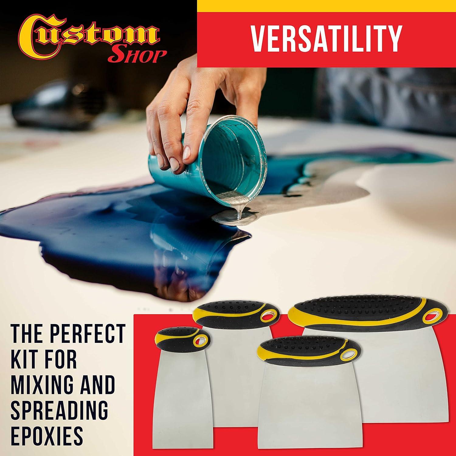 Custom Shop Body Filler Mixing Board with 4, 5, & 6 Inch Plastic Body Filler Spreader Tools for Automotive Body Fillers, Putties, Glazes, Epoxy Resin – Plastic Spreader Tool Variety Pack