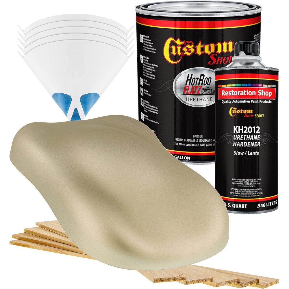 Paint Kit includes 1 Gallon of Hot Rod Flatz Single Stage Acrylic Urethane Paint Color, 1 Quart of Custom Shop Urethane Hardener (KH2012-QT), 5 Pack of 190 Micron Nylon Automotive Strainers, and a 5 Pack of Wood Paint Mixing Sticks.
