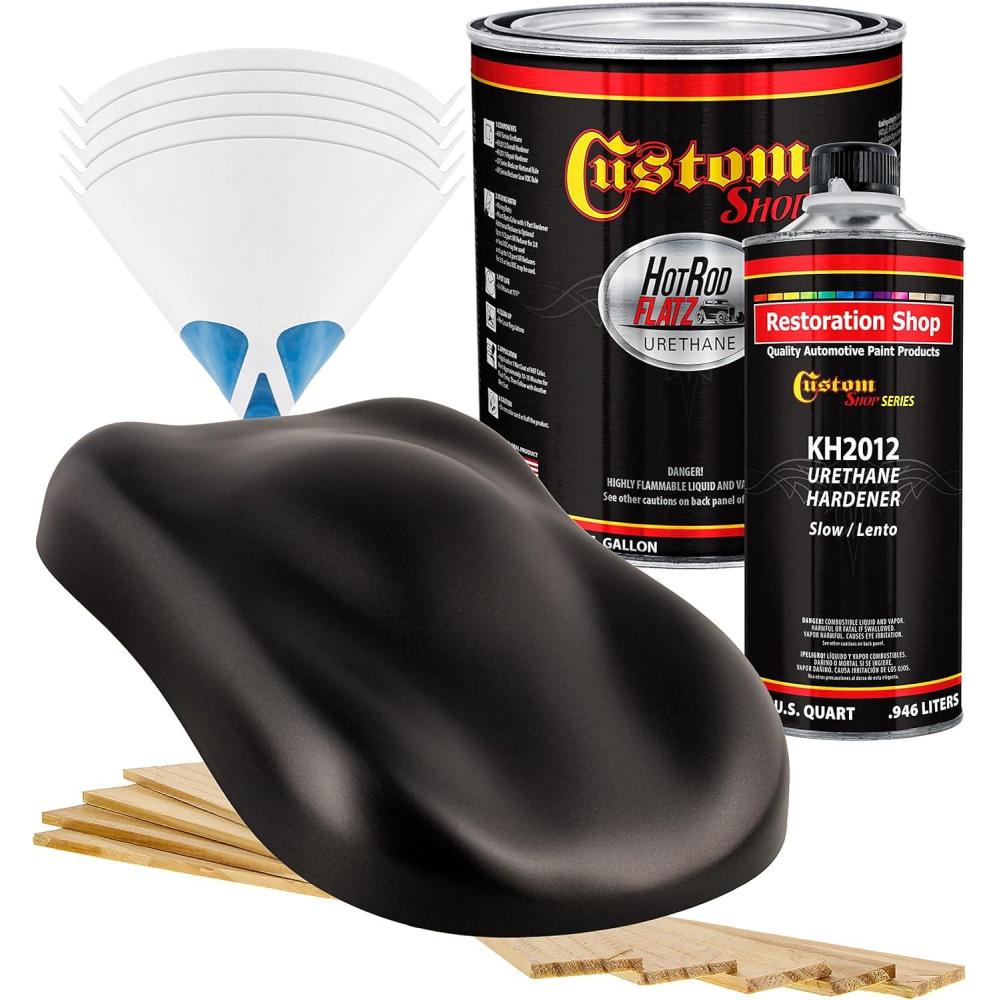 Paint Kit includes 1 Gallon of Hot Rod Flatz Single Stage Acrylic Urethane Paint Color, 1 Quart of Custom Shop Urethane Hardener (KH2012-QT), 5 Pack of 190 Micron Nylon Automotive Strainers, and a 5 Pack of Wood Paint Mixing Sticks.