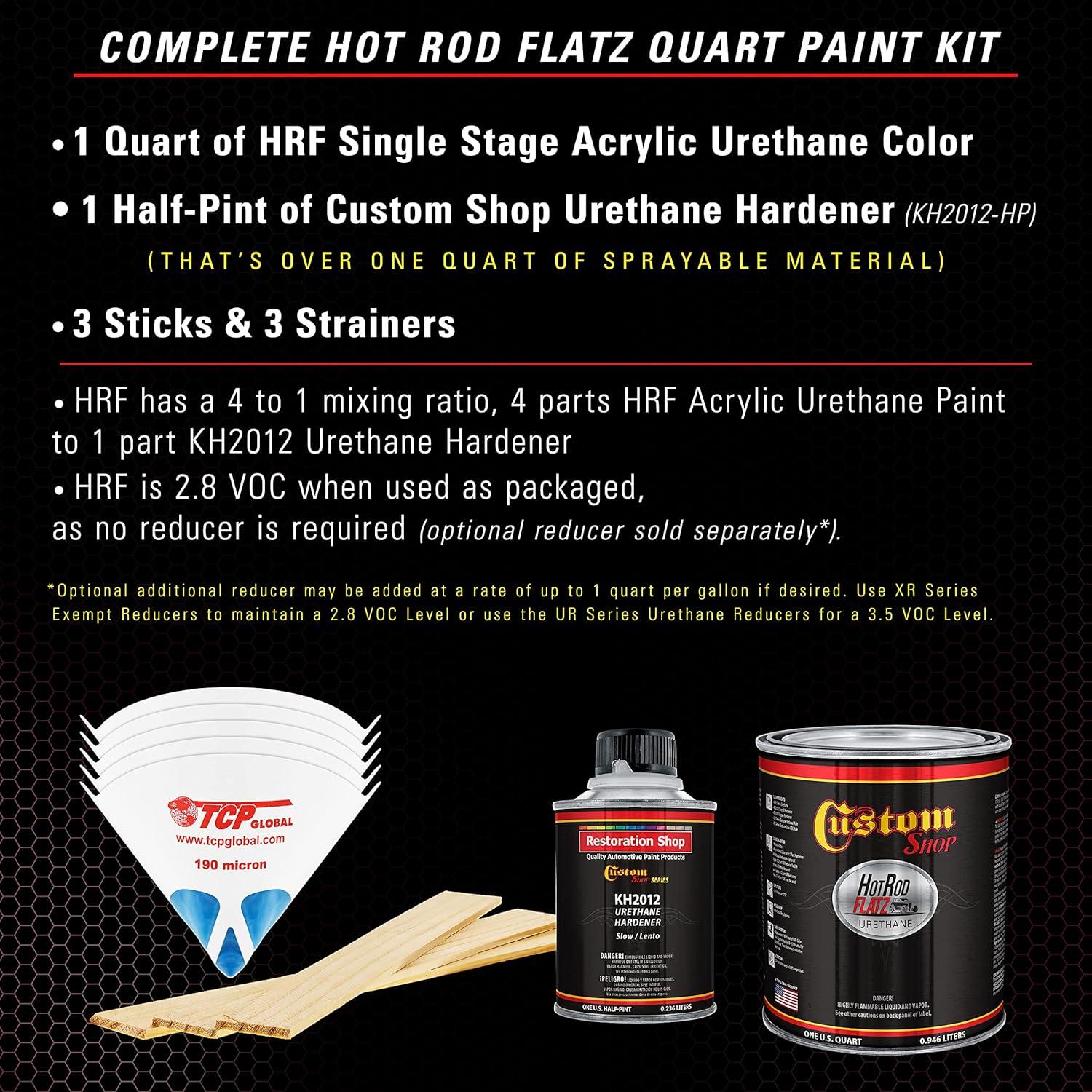 Paint Kit includes 1 Quart of Hot Rod Flatz Single Stage Acrylic Urethane Paint Color, 1 Half-Pint of Custom Shop Urethane Hardener (KH2012-HP), 3 Pack of 190 Micron Nylon Automotive Strainers, and a 3 Pack of Wood Paint Mixing Sticks.