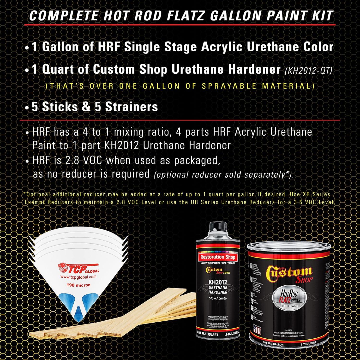 Paint Kit includes 1 Gallon of Hot Rod Flatz Single Stage Acrylic Urethane Paint Color, 1 Quart of Custom Shop Urethane Hardener (KH2012-QT), 5 Pack of 190 Micron Nylon Automotive Strainers, and a 5 Pack of Wood Paint Mixing Sticks.