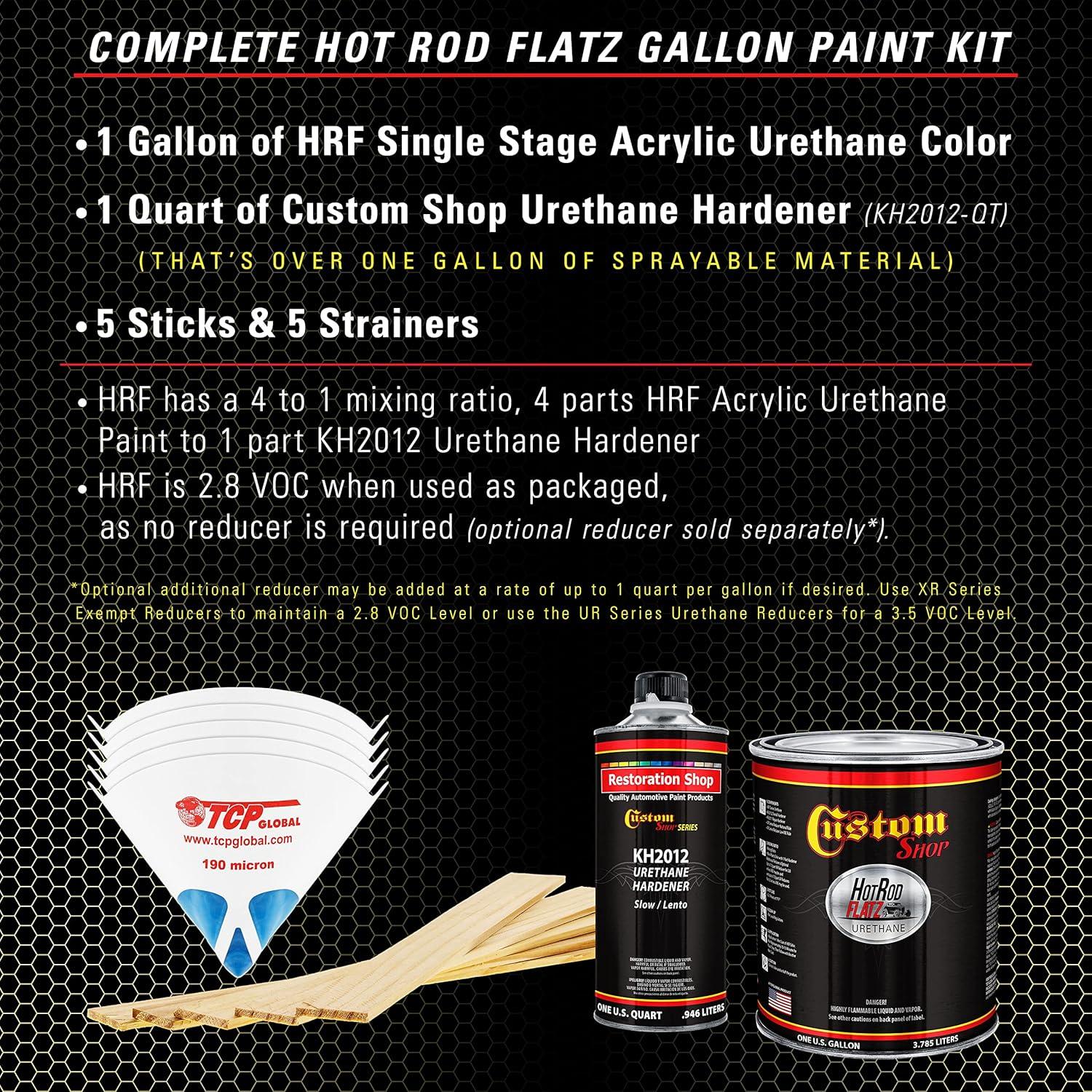 Paint Kit includes 1 Gallon of Hot Rod Flatz Single Stage Acrylic Urethane Paint Color, 1 Quart of Custom Shop Urethane Hardener (KH2012-QT), 5 Pack of 190 Micron Nylon Automotive Strainers, and a 5 Pack of Wood Paint Mixing Sticks.