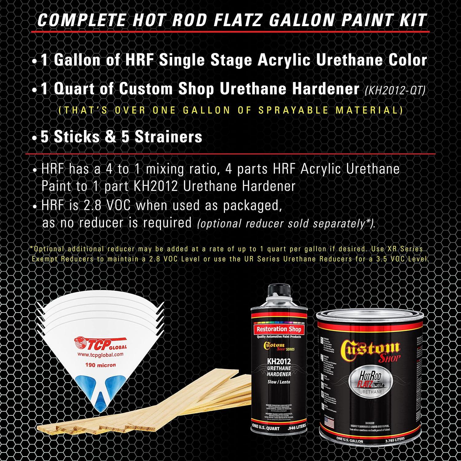 Paint Kit includes 1 Gallon of Hot Rod Flatz Single Stage Acrylic Urethane Paint Color, 1 Quart of Custom Shop Urethane Hardener (KH2012-QT), 5 Pack of 190 Micron Nylon Automotive Strainers, and a 5 Pack of Wood Paint Mixing Sticks.