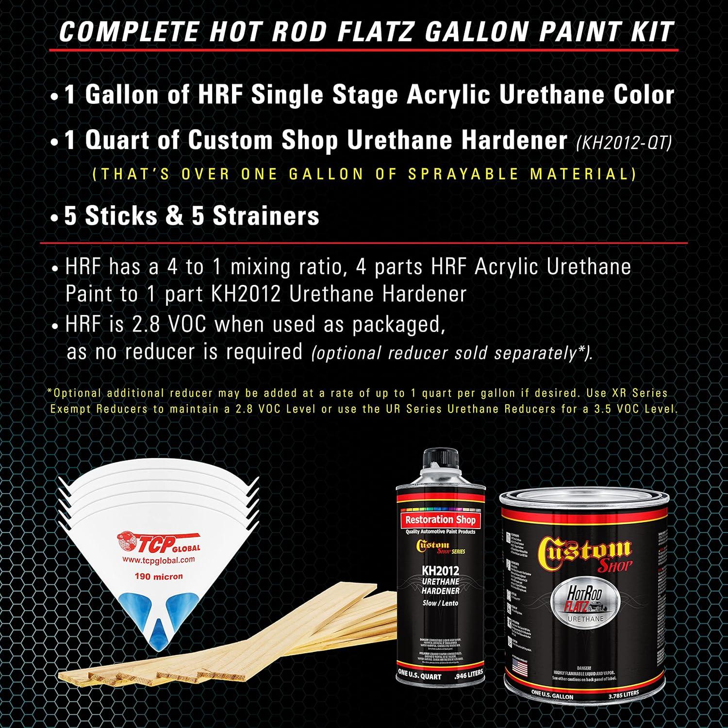 Paint Kit includes 1 Gallon of Hot Rod Flatz Single Stage Acrylic Urethane Paint Color, 1 Quart of Custom Shop Urethane Hardener (KH2012-QT), 5 Pack of 190 Micron Nylon Automotive Strainers, and a 5 Pack of Wood Paint Mixing Sticks.