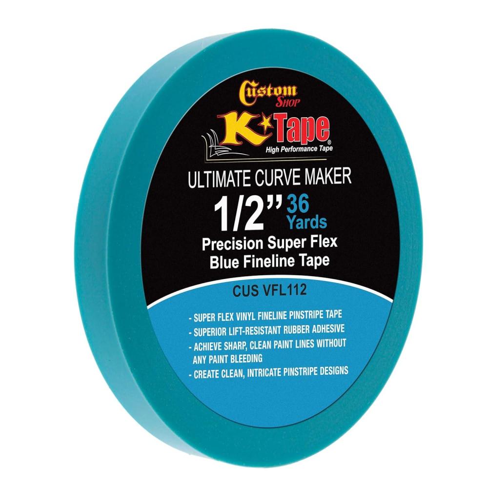 Custom Shop Super Flex Vinyl Fineline Pinstripe Tape, Blue 1/4″ x 36 Yard Roll. A high-performance conformable vinyl masking tape used to create sharp curves and fine paint lines for striping, separating colors, and making complex graphic designs.