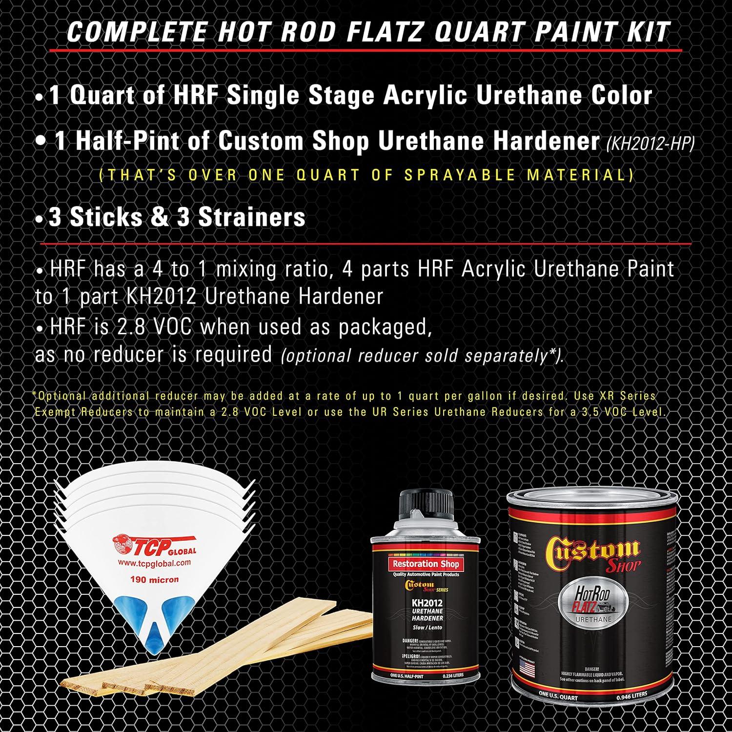 Paint Kit includes 1 Quart of Hot Rod Flatz Single Stage Acrylic Urethane Paint Color, 1 Half-Pint of Custom Shop Urethane Hardener (KH2012-HP), 3 Pack of 190 Micron Nylon Automotive Strainers, and a 3 Pack of Wood Paint Mixing Sticks.