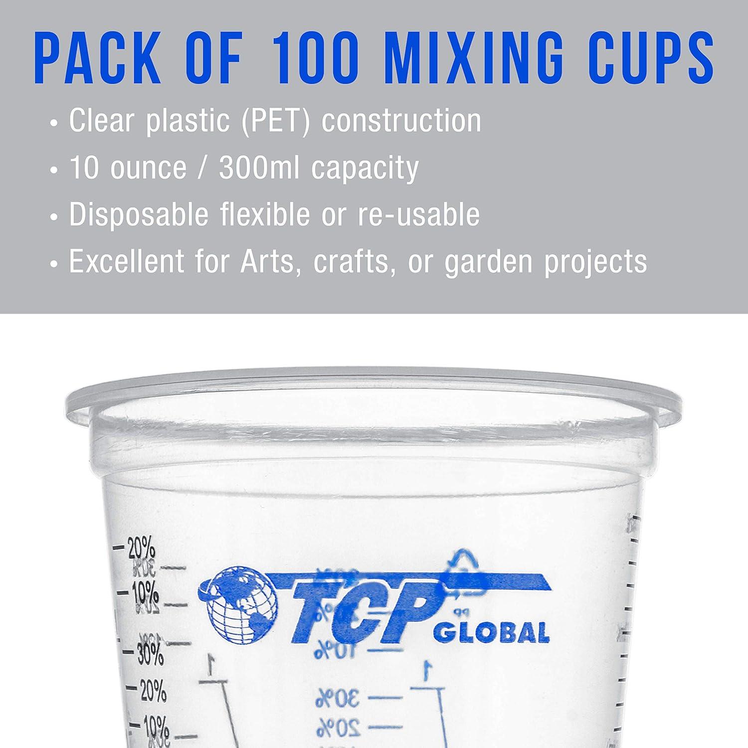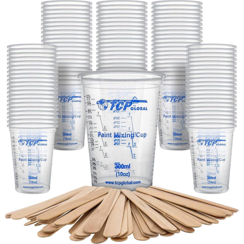 TCP Global 10 oz. (300ml) Graduated Plastic Mixing Cups – Box of 50 with 50 Mixing Sticks – Disposable Plastic Measuring Cups for Liquids, Paints, Resin, Epoxy, Art, Kitchen – Ratios 2-1, 3-1, 4-1 ML(100)