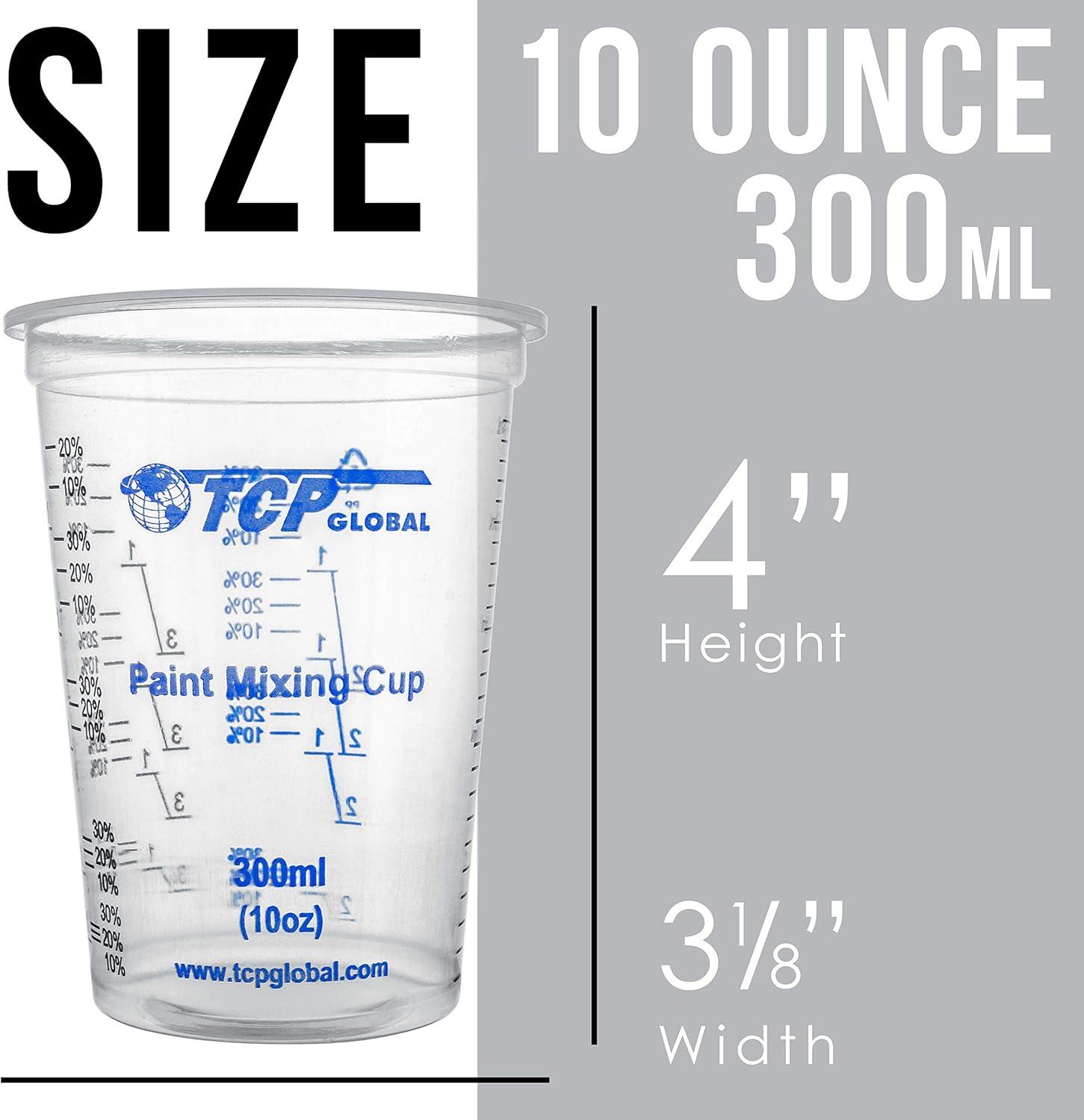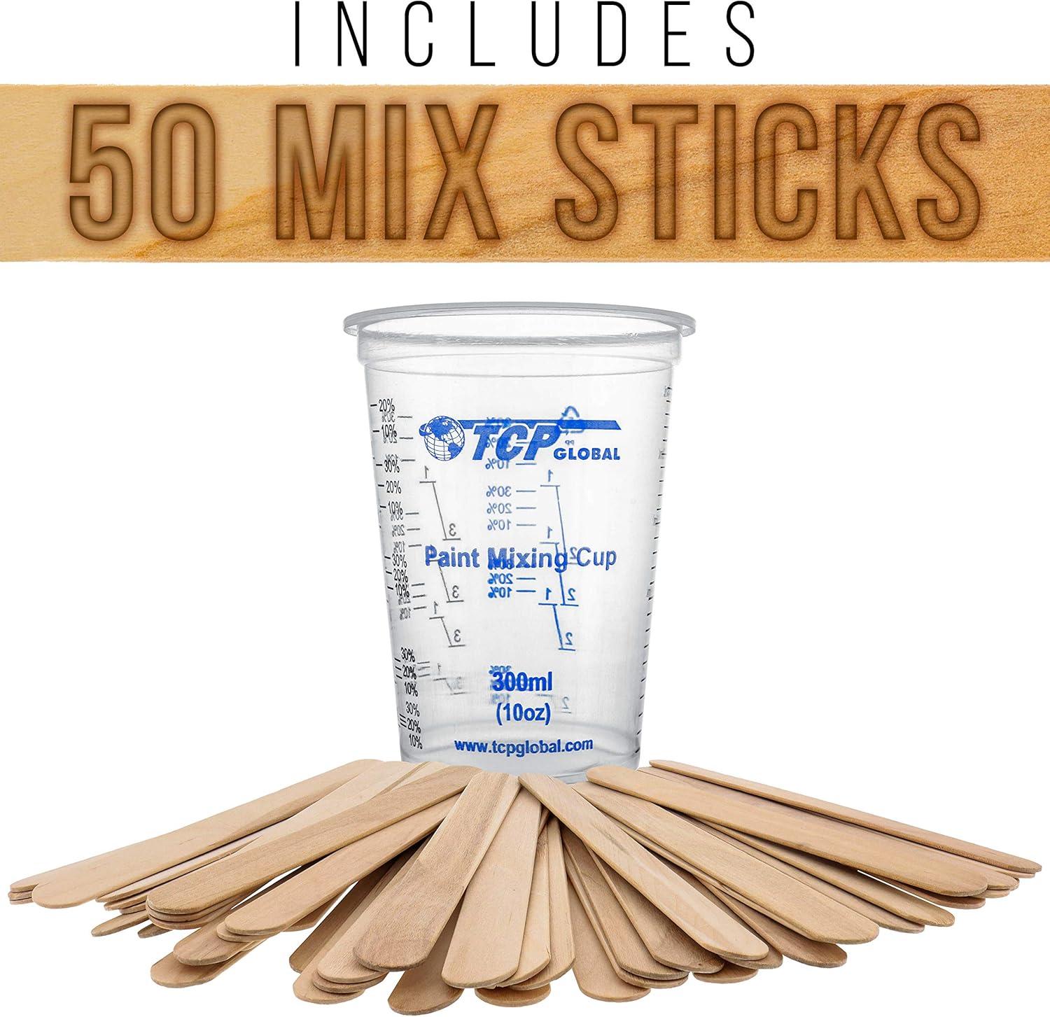 TCP Global 10 oz. (300ml) Graduated Plastic Mixing Cups - Box of 50 with 50 Mixing Sticks - Disposable Plastic Measuring Cups for Liquids, Paints, Resin, Epoxy, Art, Kitchen - Ratios 2-1, 3-1, 4-1 ML(100)