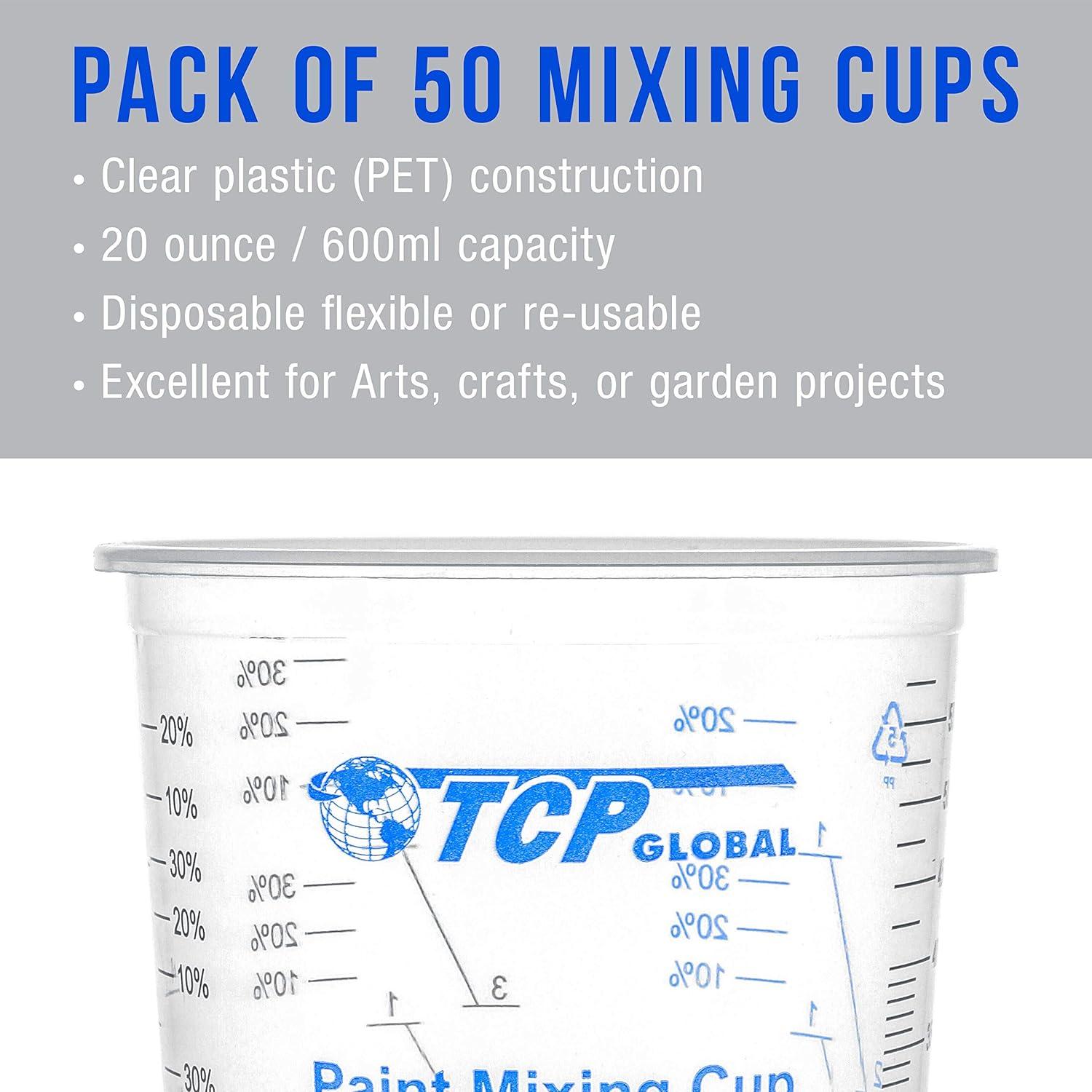 Mixing Cup Kit with 25 – 20 Ounce (600 ml) disposable flexible, clear graduated plastic mixing cups along with 25 mini wooden paint and liquid mix stick paddles.